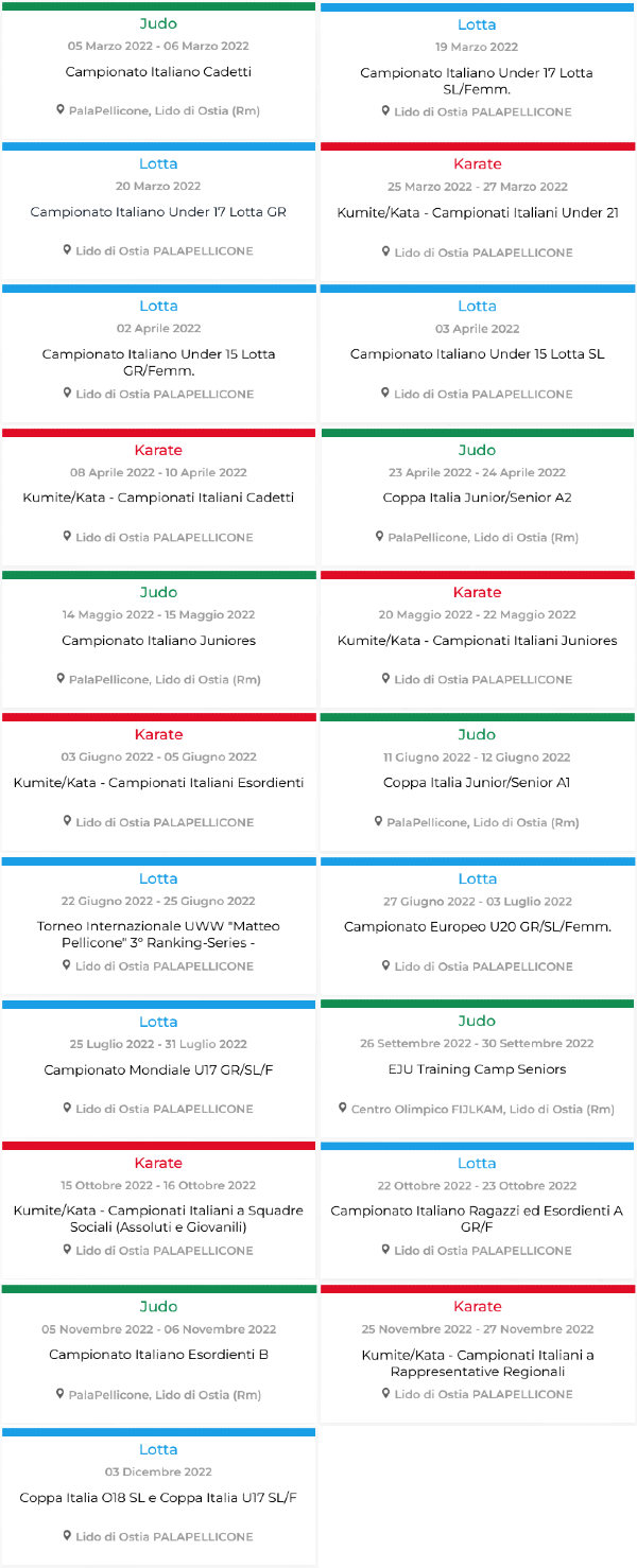 An exciting event that provides several category championships from February until December 2022! If you are a sports fan and you are looking for accommodation, the best place to stay near the Palapellicone is Camping Village Roma Capitol, just 3.8 km away by car (about 7 minutes) from the sports facilities that will host the matches!